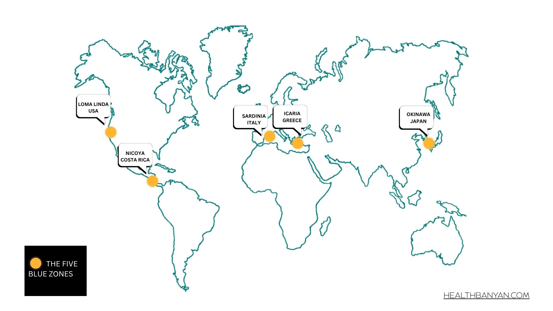 स्वाभाविक रूप से सक्रिय दैनिक दिनचर्या, पौधों से समृद्ध आहार, छोटे हिस्से में भोजन, मजबूत रिश्ते, कम तनाव सामुदायिक समर्थन, उद्देश्य से प्रेरित जीवन, कम जंक और अधिक ताजा भोजन।